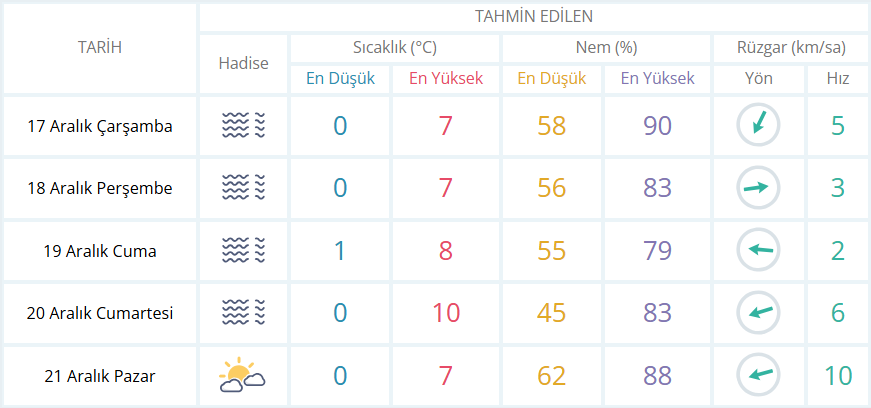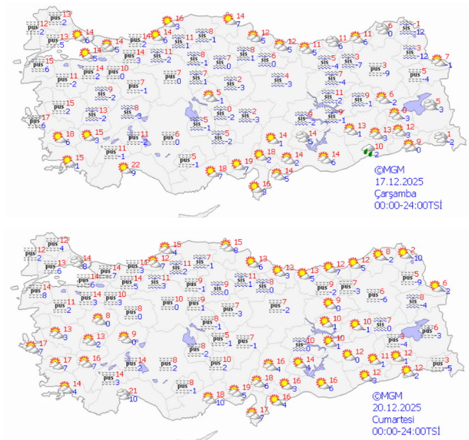 Meteoroloji Genel müdürlüğü (MGM) internet sitesinden alınan bilgilere göre 17-22 Aralık döneminde yurdun büyük bölümünde sis ve puslu havayla birlikte soğuk hava da etkili olacak.